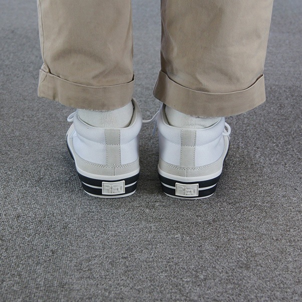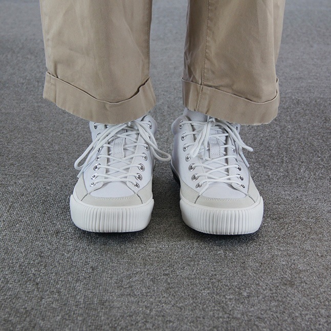 BAGELの特徴であるミッドカットスニーカーはくるぶし丈で履き口がすっきりと作られており、シューレースを締めると足全体を優しくホールドしてくれます。