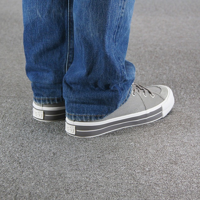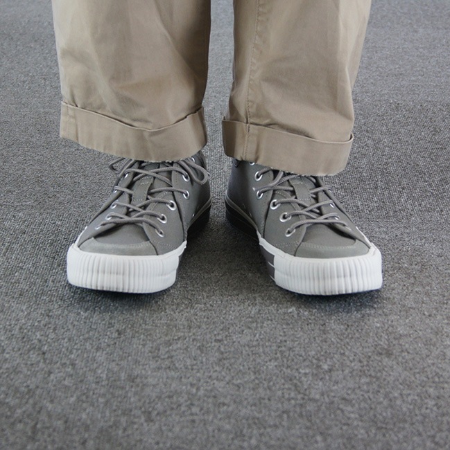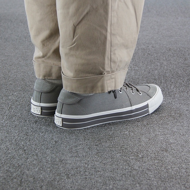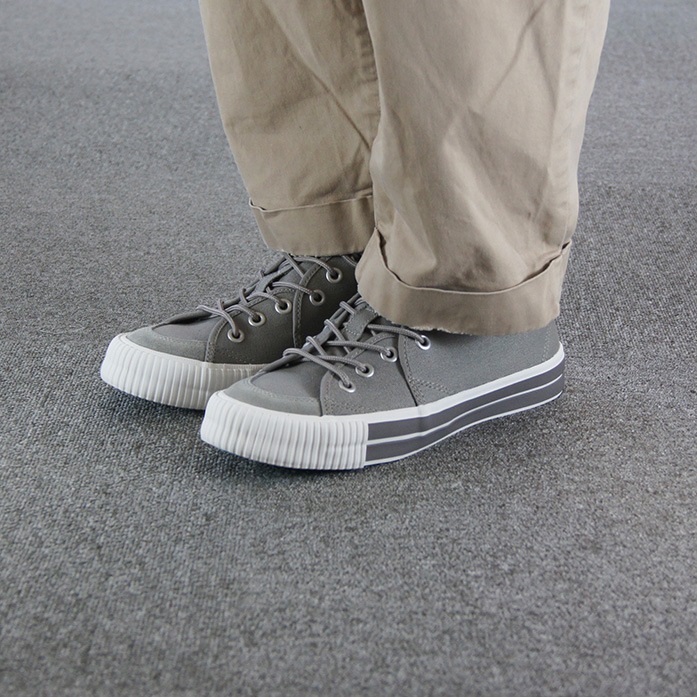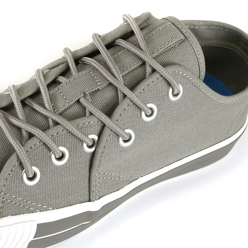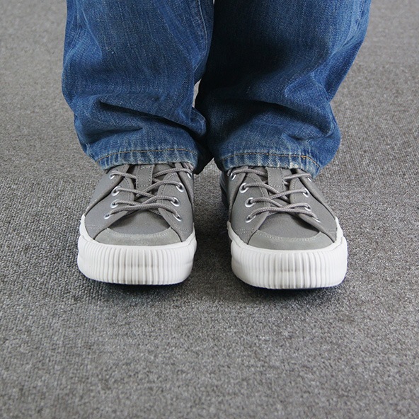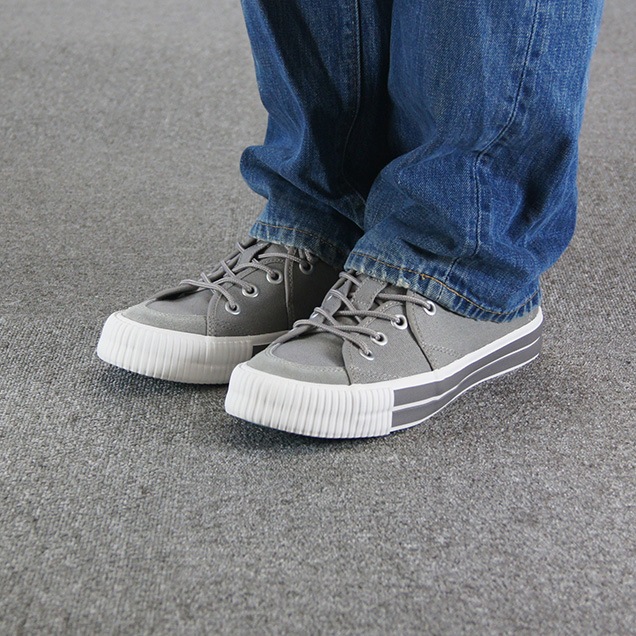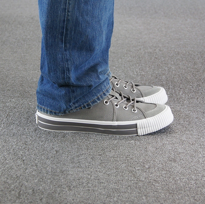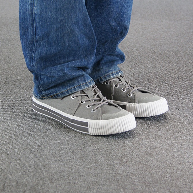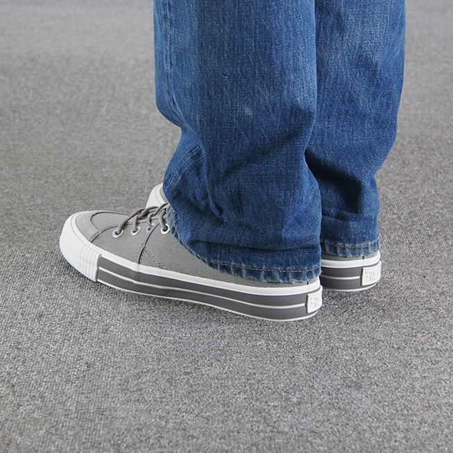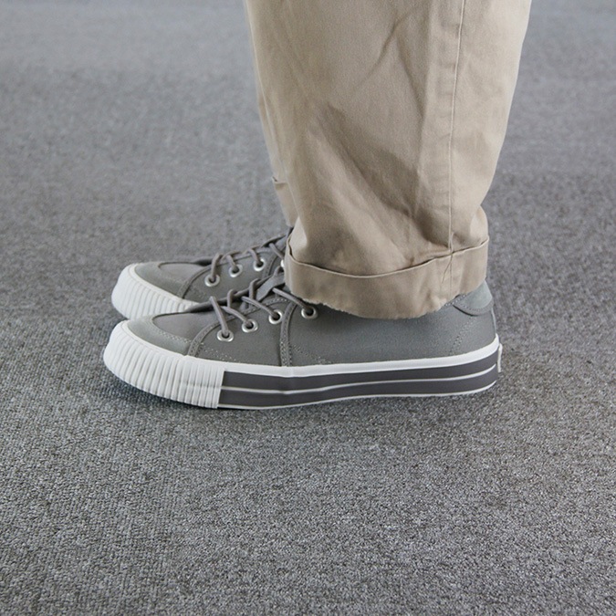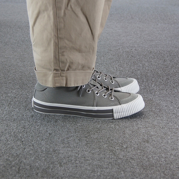 アッパーには柔らかいグレーのキャンバス素材が使用されており、通気性が良く、快適な履き心地を実現しています。