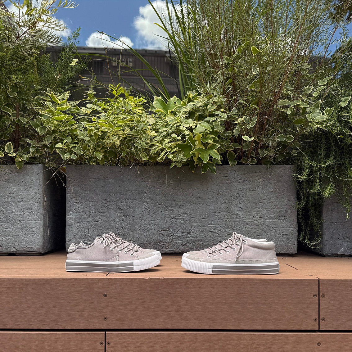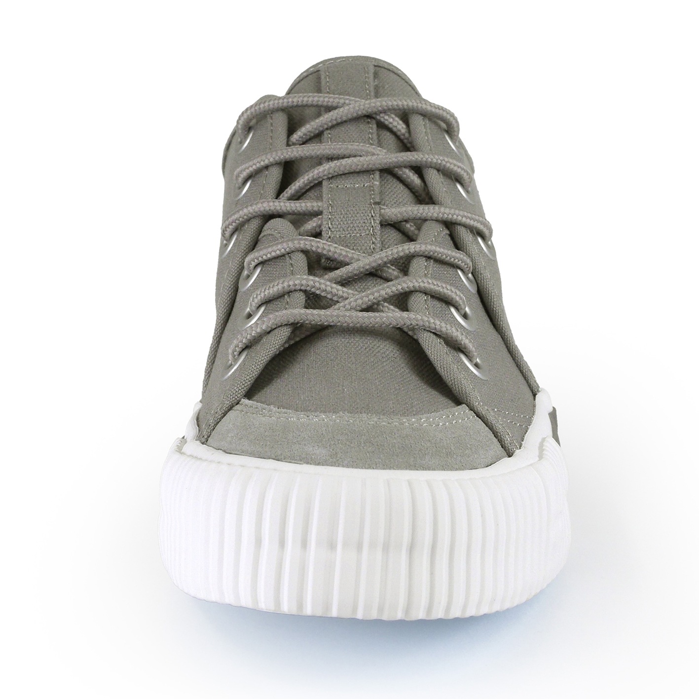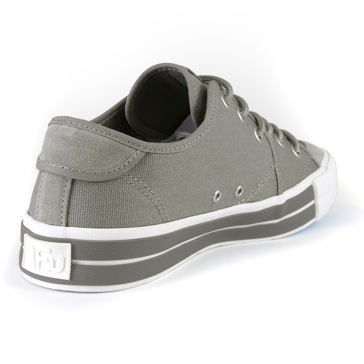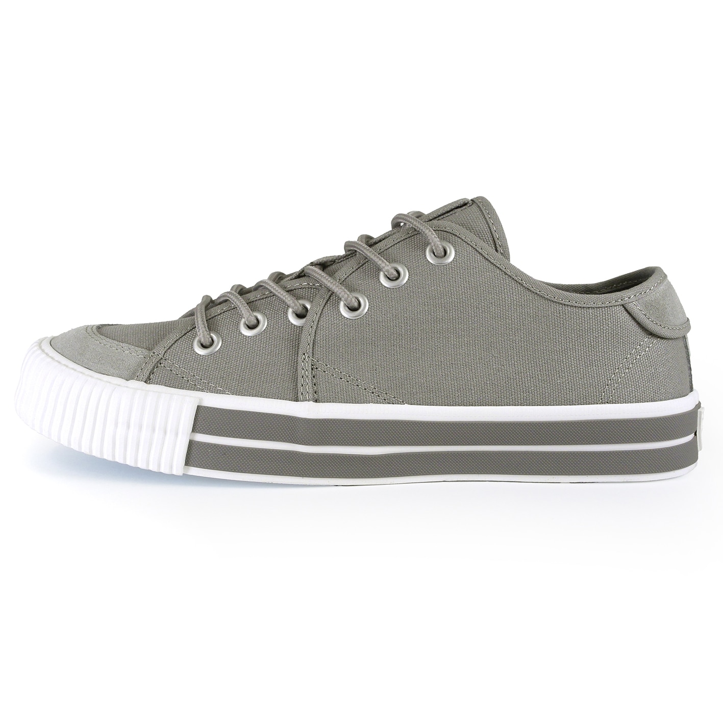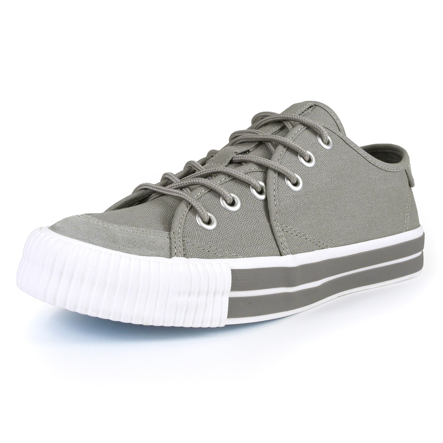 アッパーには柔らかいグレーのキャンバス素材が使用されており、通気性が良く、快適な履き心地を実現しています。